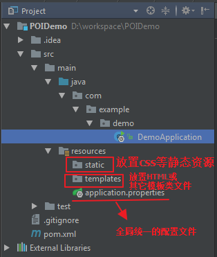 然后,下图就是项目的结构,其中自动帮我们创建了启动类 DemoApplication.java,还有配置文件 application.properties